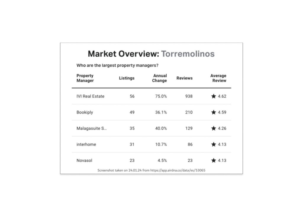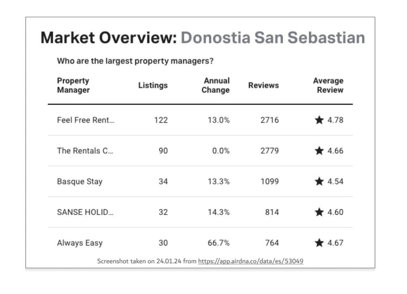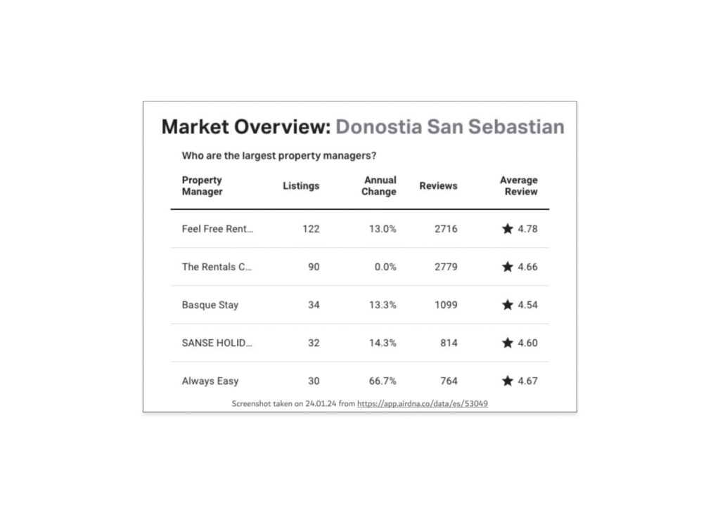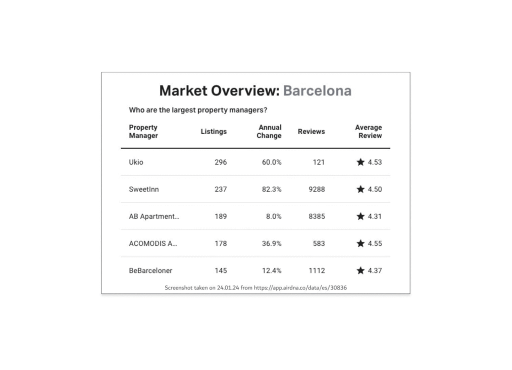 Comparative study of the 100 largest Airbnb & VRBO hosts in Spain’s 20 main tourist cities in January 2024. Our rating is the highest among the hosts with 50+ listings and 1000+ reviews.